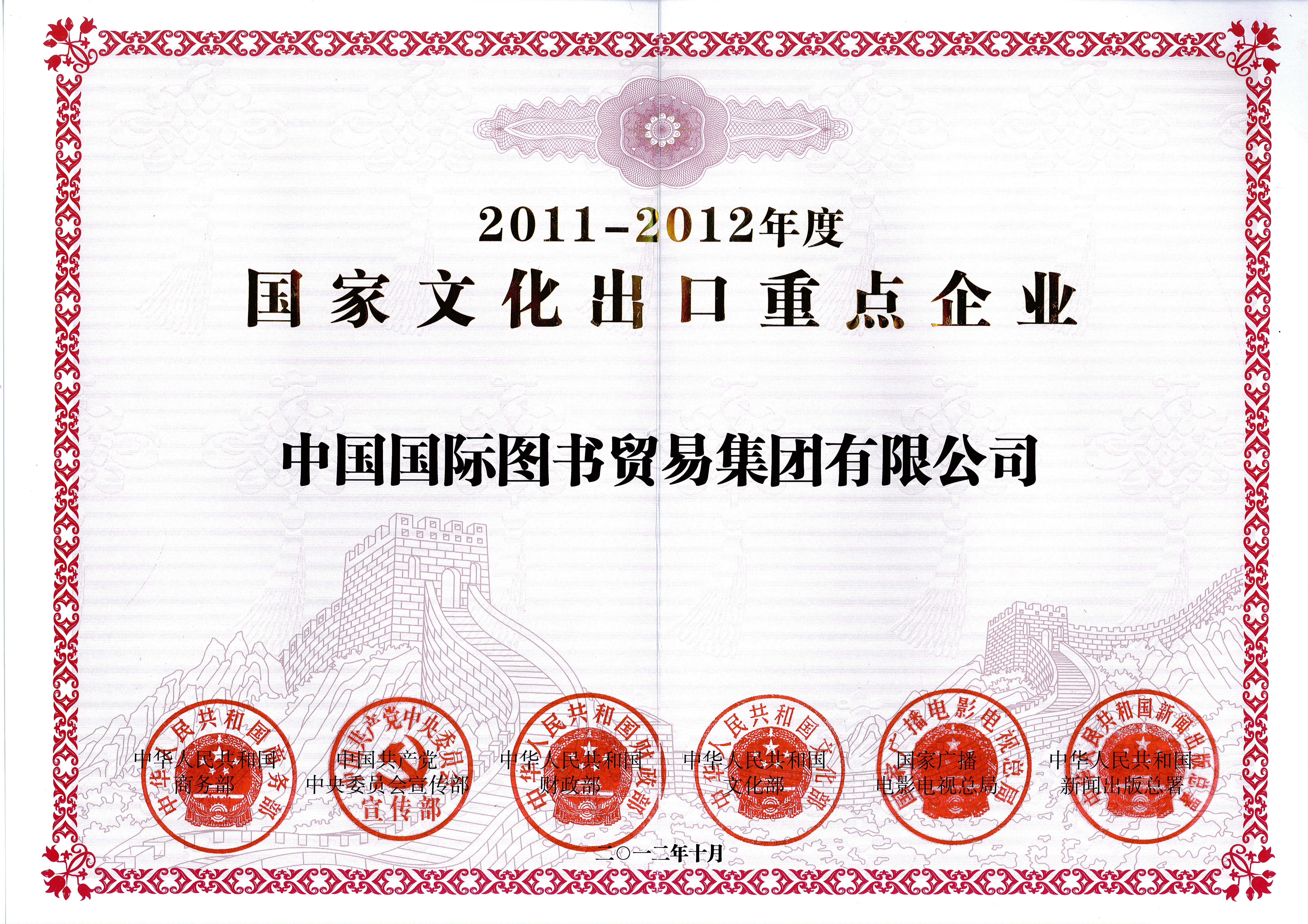 2012年10月,國(guó)圖集團(tuán)公司榮獲商務(wù)部、中宣部、財(cái)政部、文化部、廣電總局和新聞出版總署聯(lián)合授予的“2011-2012年度國(guó)家文化出口重點(diǎn)企業(yè)”稱號(hào)。集團(tuán)公司亞馬遜中國(guó)書店項(xiàng)目、中國(guó)圖書貿(mào)易法國(guó)百周年出版發(fā)行有限公司運(yùn)營(yíng)項(xiàng)目被授予“2011-2012年度國(guó)家文化出口重點(diǎn)項(xiàng)目”。