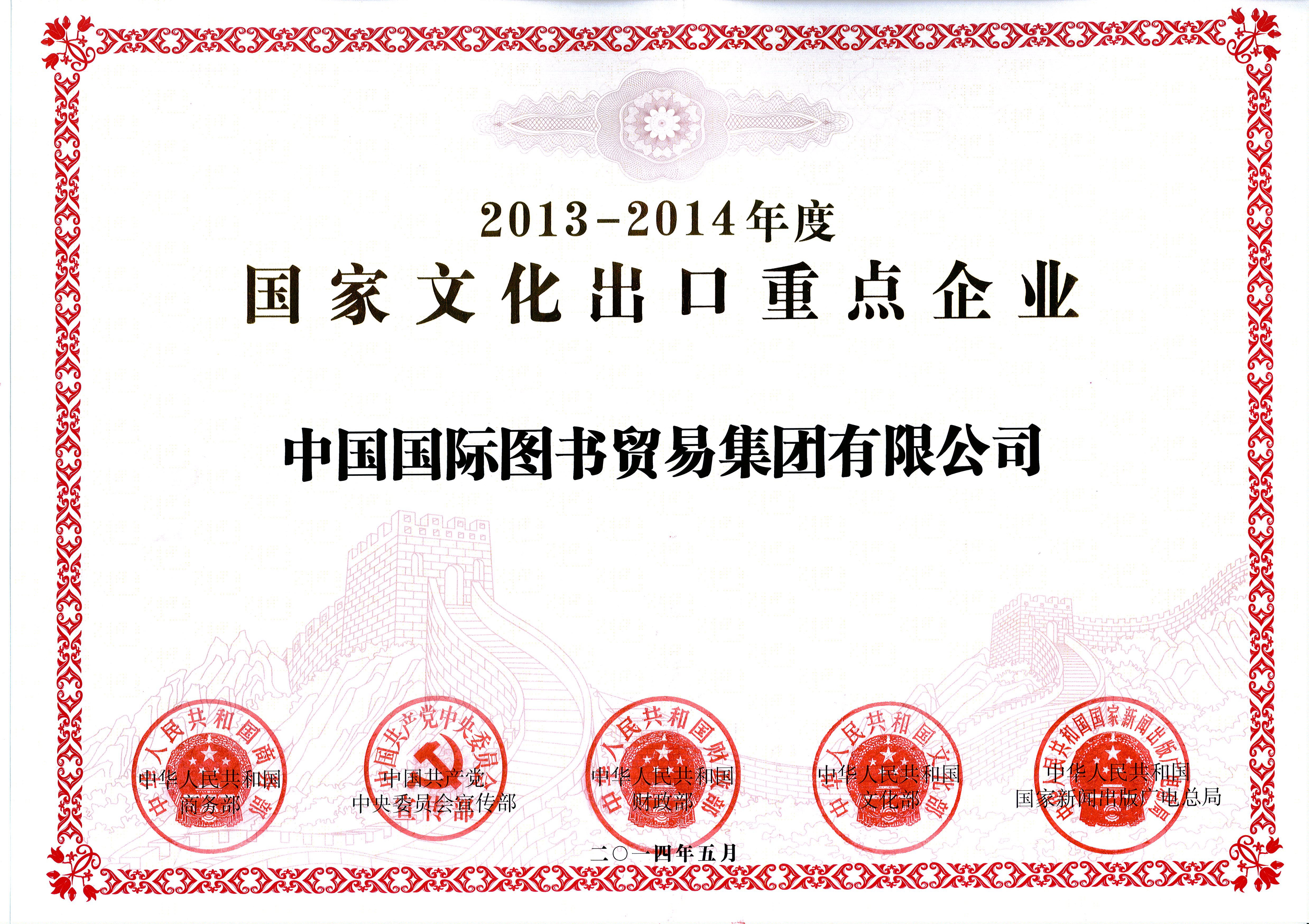 2014年5月,國(guó)圖集團(tuán)公司榮獲由國(guó)家商務(wù)部、中宣部、財(cái)政部、文化部、國(guó)家新聞出版廣電總局共同頒發(fā)的“2013-2014年度國(guó)家文化出口重點(diǎn)企業(yè)”稱號(hào)。國(guó)圖集團(tuán)公司的“國(guó)圖海外華文書店?duì)I銷網(wǎng)絡(luò)計(jì)劃”、“國(guó)圖歐洲出版發(fā)行基地(倫敦中心)項(xiàng)目”榮獲“2013-2014年度國(guó)家文化出口重點(diǎn)項(xiàng)目”稱號(hào)。