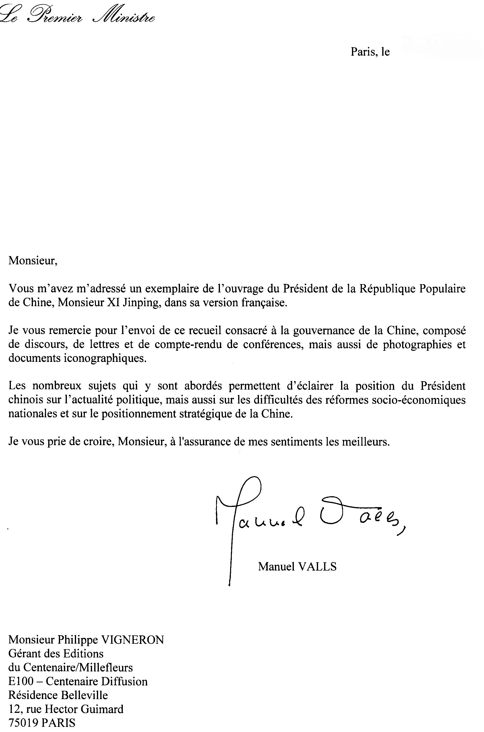 2015年5月,集團(tuán)公司所屬法國(guó)百周年出版社收到了來(lái)自法國(guó)總理曼努埃爾?瓦爾斯的感謝信。信中寫到“感謝你們贈(zèng)送給我由中華人民共和國(guó)主席習(xí)近平撰寫的《習(xí)近平談治國(guó)理政》一書的法文版。本書圖文并茂,囊括了關(guān)于如何治理中國(guó)的重要講話和文件。主題涉及當(dāng)今中國(guó)的政治情況,國(guó)內(nèi)社會(huì)經(jīng)濟(jì)體制改革及戰(zhàn)略。請(qǐng)接受我最誠(chéng)摯的感謝。——總理曼努埃爾?瓦爾斯?!?/span>