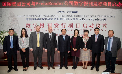 2016年4月15日,國(guó)圖集團(tuán)公司和加拿大PressReader公司聯(lián)合舉辦了數(shù)字報(bào)刊發(fā)行項(xiàng)目啟動(dòng)儀式。中國(guó)外文局副局長(zhǎng)王剛毅、副總編輯陳實(shí),國(guó)家新聞出版廣電總局新聞報(bào)刊司副司長(zhǎng)趙秀玲,加拿大駐中國(guó)使館貿(mào)易專員韓穎,加拿大PressReader公司首席內(nèi)容官Nikolay Malyarov、內(nèi)容主管Steve Chapman,集團(tuán)公司常務(wù)副總經(jīng)理賈強(qiáng),副總經(jīng)理朱曉捷、夏戰(zhàn)生和外文局相關(guān)部室領(lǐng)導(dǎo)參加了啟動(dòng)儀式。