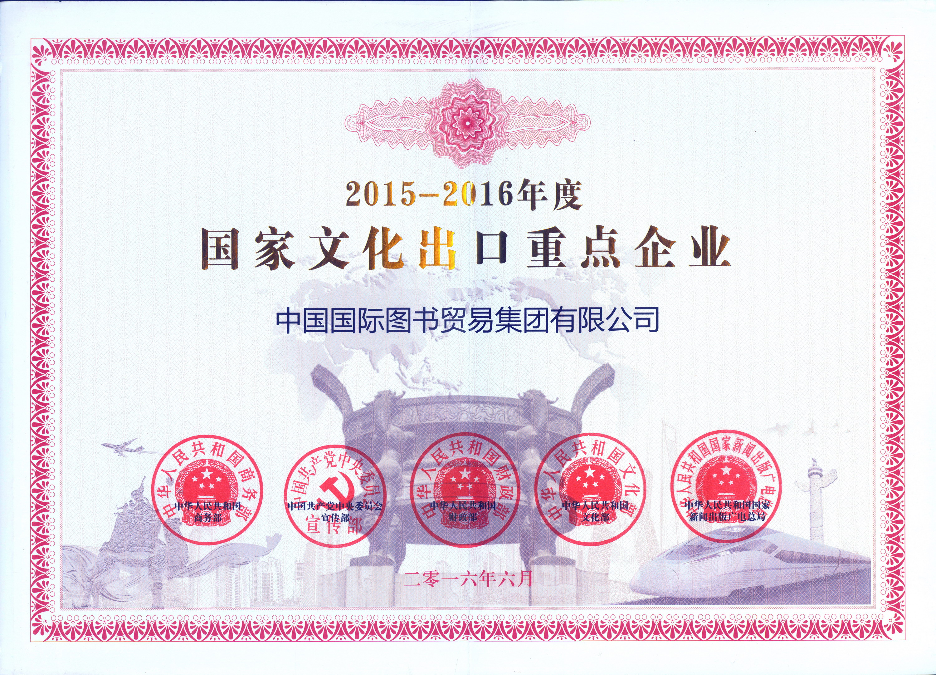 2016年6月,國(guó)圖集團(tuán)公司榮獲國(guó)家商務(wù)部、中共中央宣傳部、財(cái)政部、文化部、國(guó)家新聞出版廣電總局頒發(fā)的2015-2016年度國(guó)家文化出口重點(diǎn)企業(yè)稱號(hào)。國(guó)圖集團(tuán)公司“亞馬遜中國(guó)項(xiàng)目”榮獲2015-2016年度國(guó)家文化出口重點(diǎn)項(xiàng)目稱號(hào)。