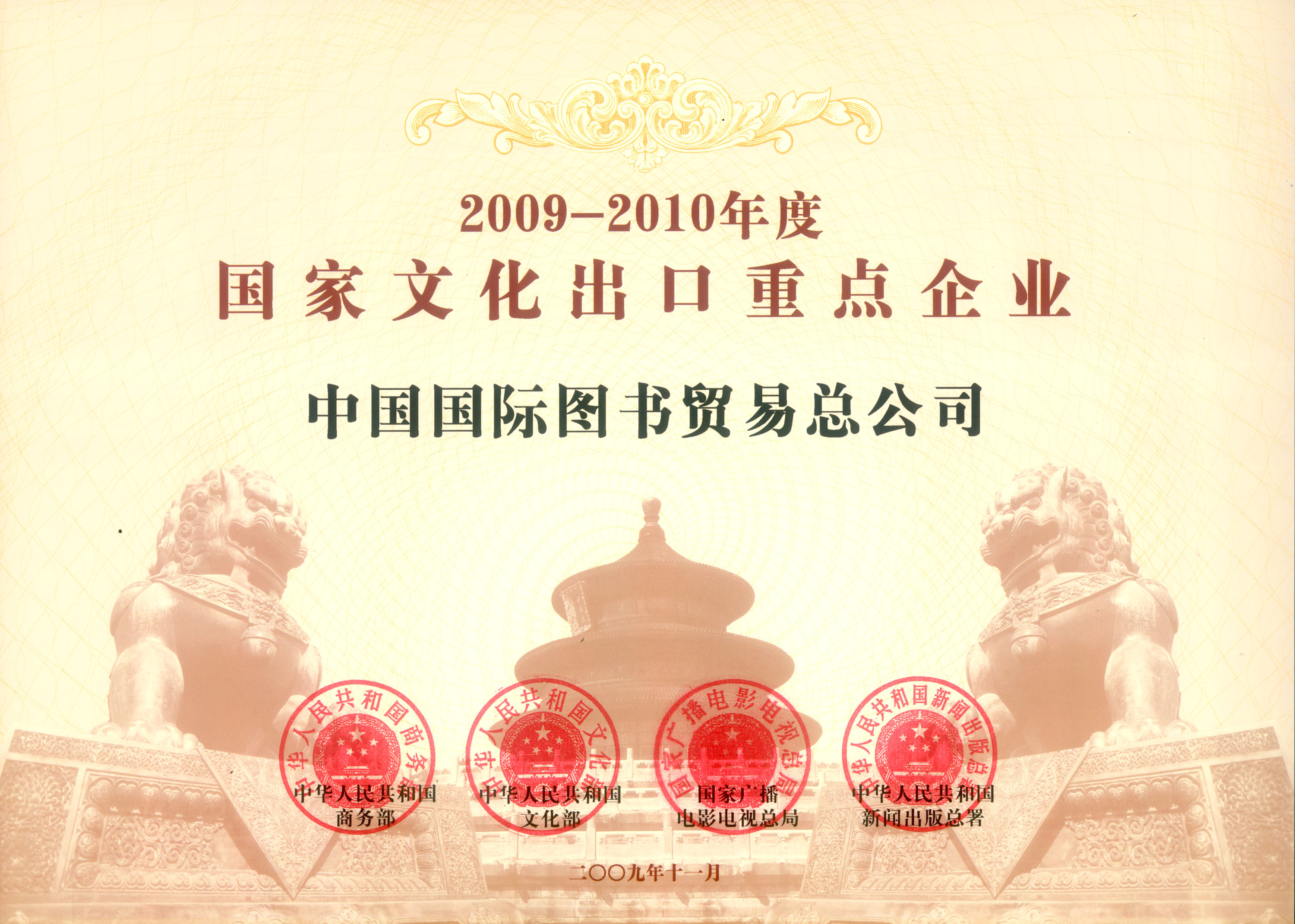 2009年11月24日,由商務(wù)部主辦、北京市人民政府協(xié)辦的第二屆中國(guó)服務(wù)貿(mào)易大會(huì)“2009-2010年度國(guó)家文化出口重點(diǎn)企業(yè)和重點(diǎn)項(xiàng)目授牌儀式”上,國(guó)圖總公司被商務(wù)部、文化部、廣電總局、新聞出版總署聯(lián)合授予“2009-2010年度國(guó)家文化出口重點(diǎn)企業(yè)”稱號(hào)。